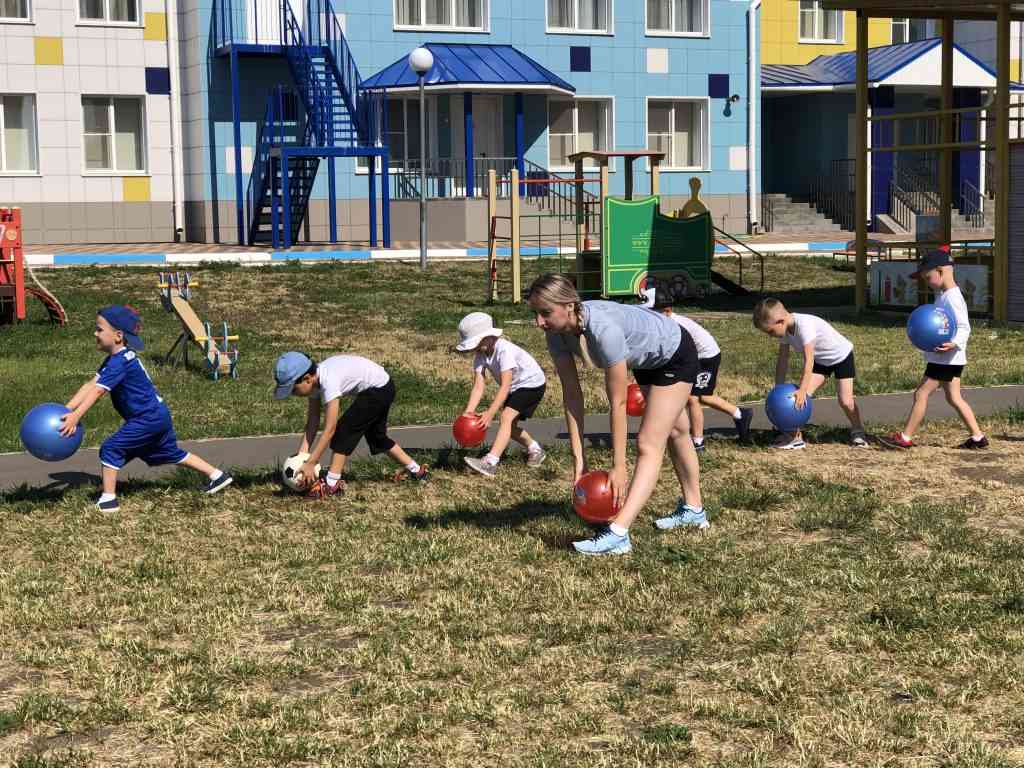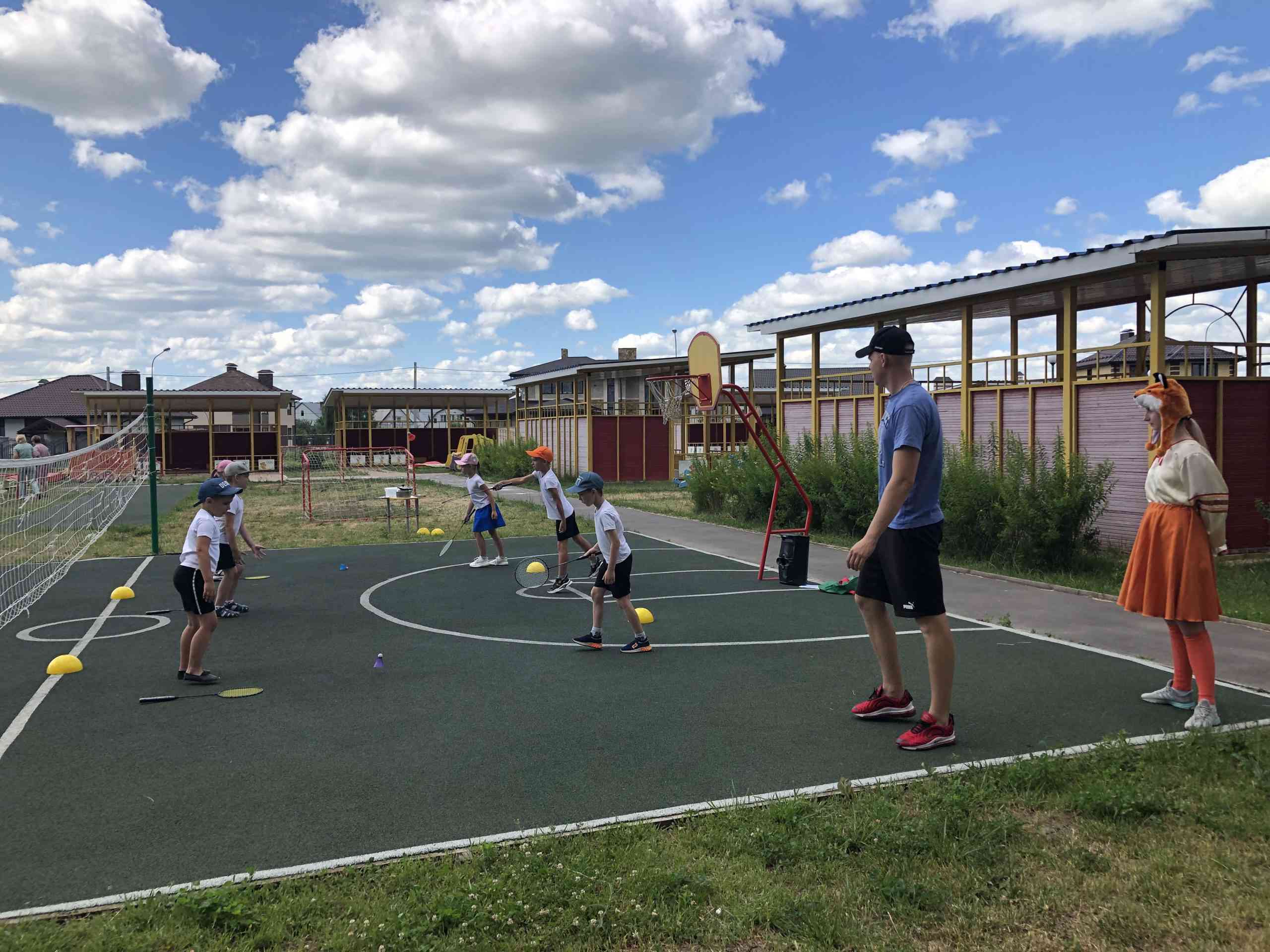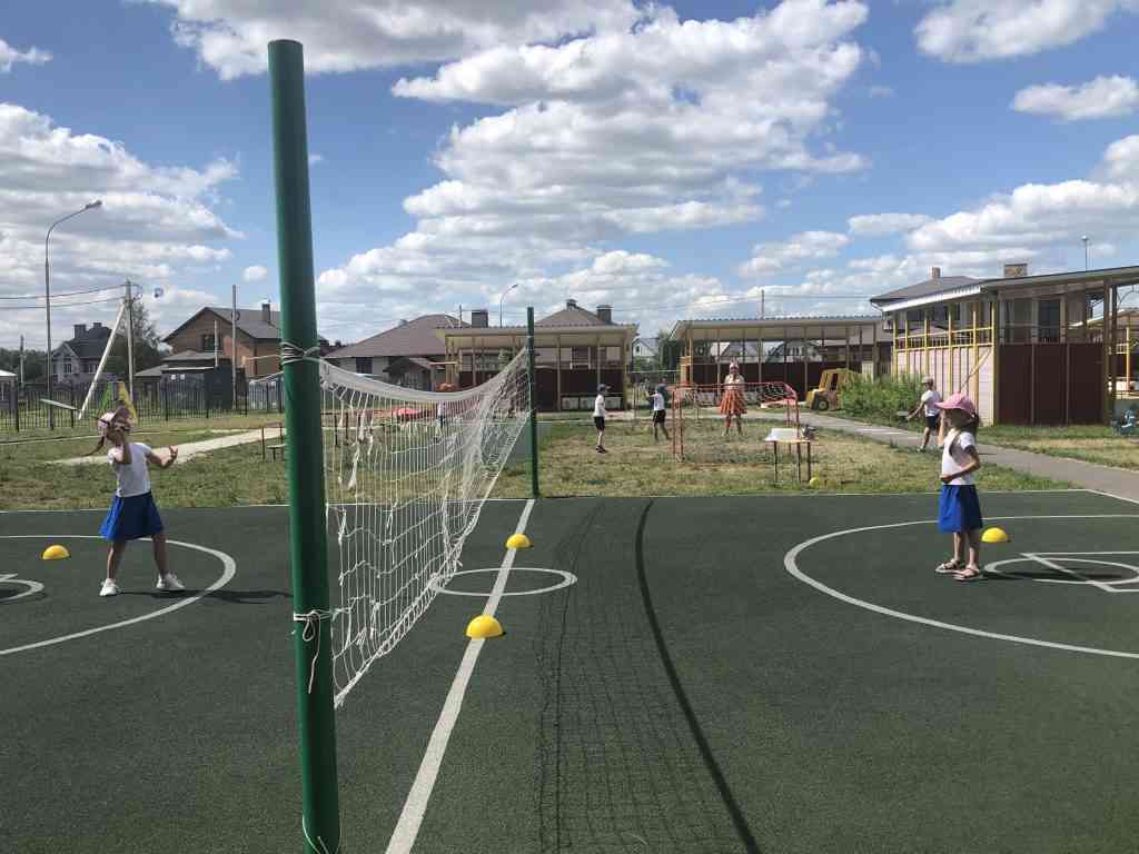 Мережко М.В., инструктор по физической культуре, учит детей элементам волейбольной игры на спортивной площадке. Дети успешно осваивают игровые упражнения «Передай, не роняй», «Подбрось, поймай», «Ходим, бросаем, ловим», «Успей поймать».