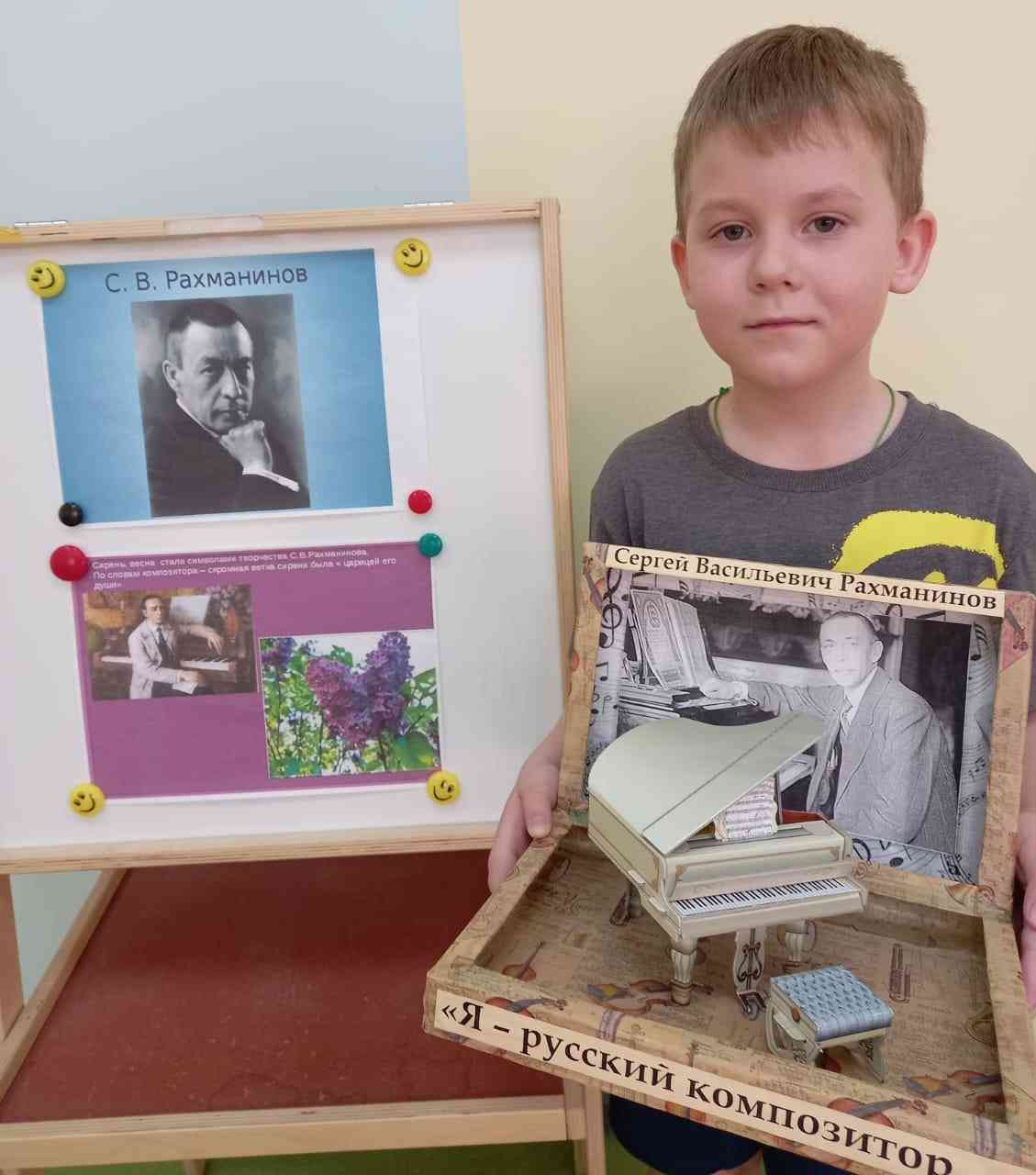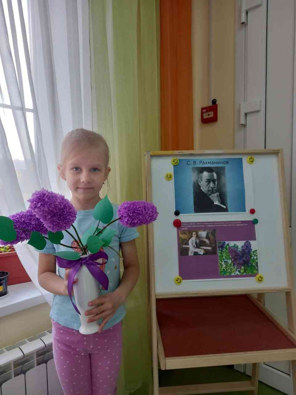 Однажды, после концерта, Рахманинов получил большой букет белой сирени. Ни подписи, ни открытки, ничего, говорящего о дарителе, только благоухающие свежие цветы. С того времени, где бы он ни выступал, в какой бы стране ни находился, кто-то все так же дарил ему сирень. Она неизменно украшала его концерты и комнаты в гостиницах. Каждый День рождения ему приносили домой такой же белоснежный букет. И поместье композитора в Ивановке до сих пор украшают шикарные кусты сирени. Именно об этом узнали сегодня наши воспитанники, приняв участие в занятии-фантазии «Незнакомый Рахманинов». Пофантазировав, им захотелось подарить великому композитору свои букеты сирени, не похожие друг на друга, ведь выполнены они с использованием различных техник. Ребята также нарисовали рисунки к другим произведениям С.В.Рахманинова, с родителями сделали поделки, а на музыкальных занятиях исполнили танец с цветами сирени и импровизировали на инструментах под «Итальянскую польку».