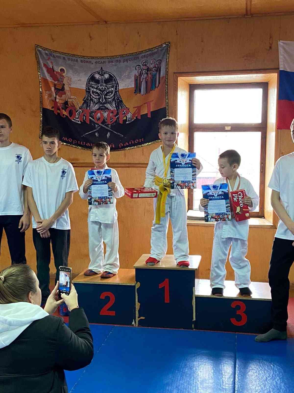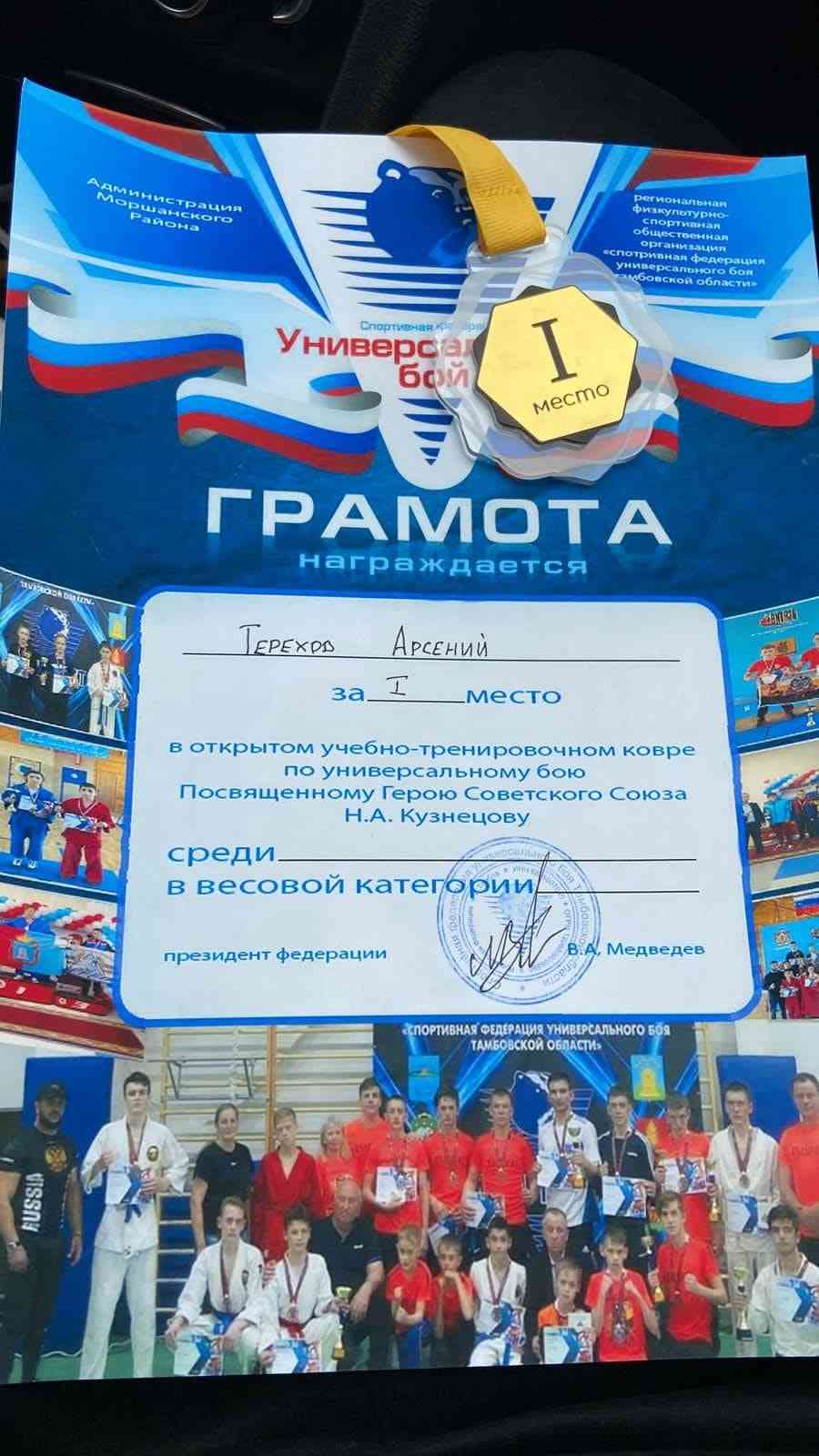 Растим чемпионов! Воспитанник группы №9 Терехов Арсений принял участие в соревнованиях по универсальному бою, походившему в Моршанске и завоевал 1 место!!!Поздравляем Арсения с заслуженной наградой и желаем новых побед!
