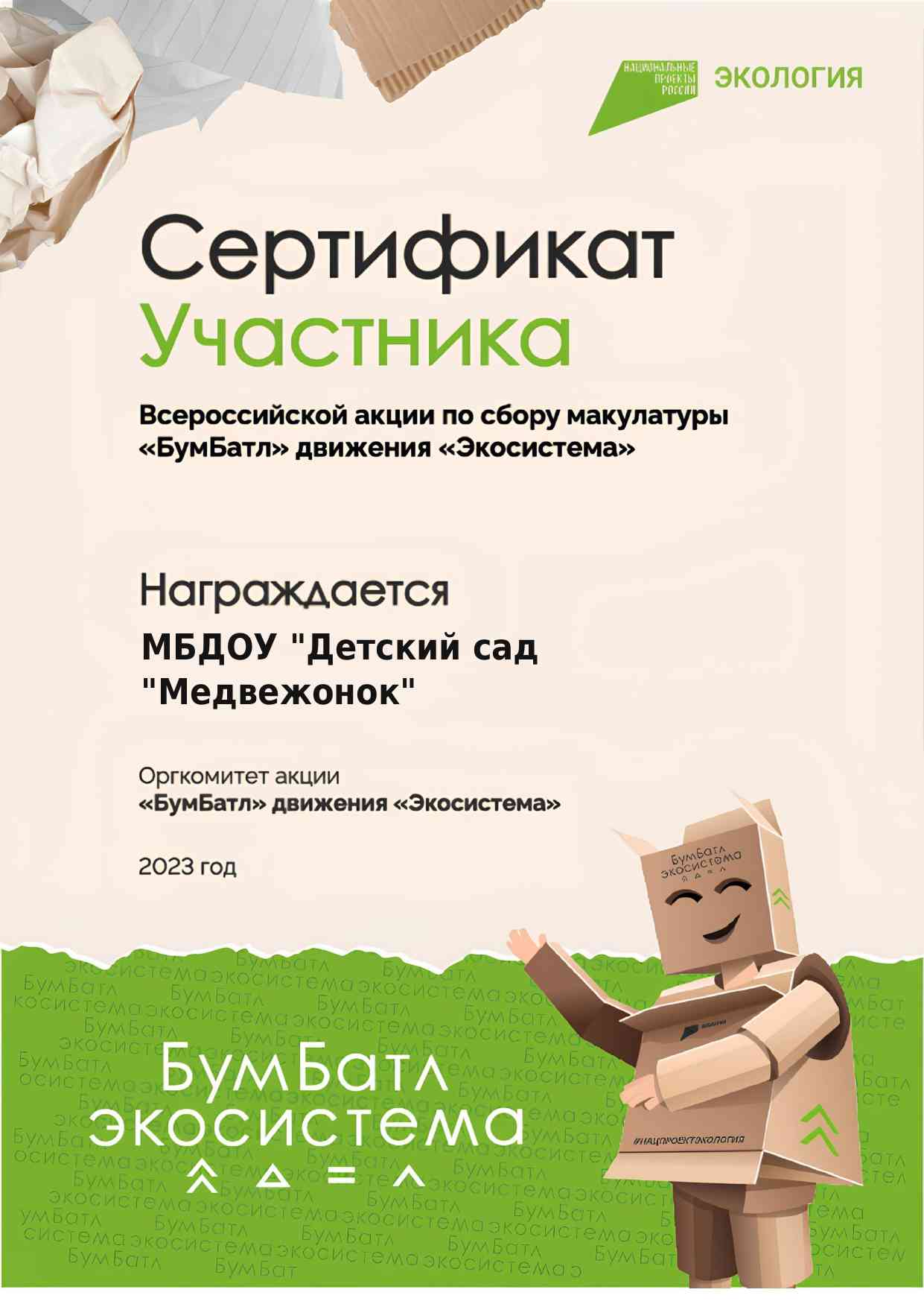 Детский сад награжден сертификатом участника БумБатла. Победители и призеры- грамотами, а родители получили благодарственные грамоты!